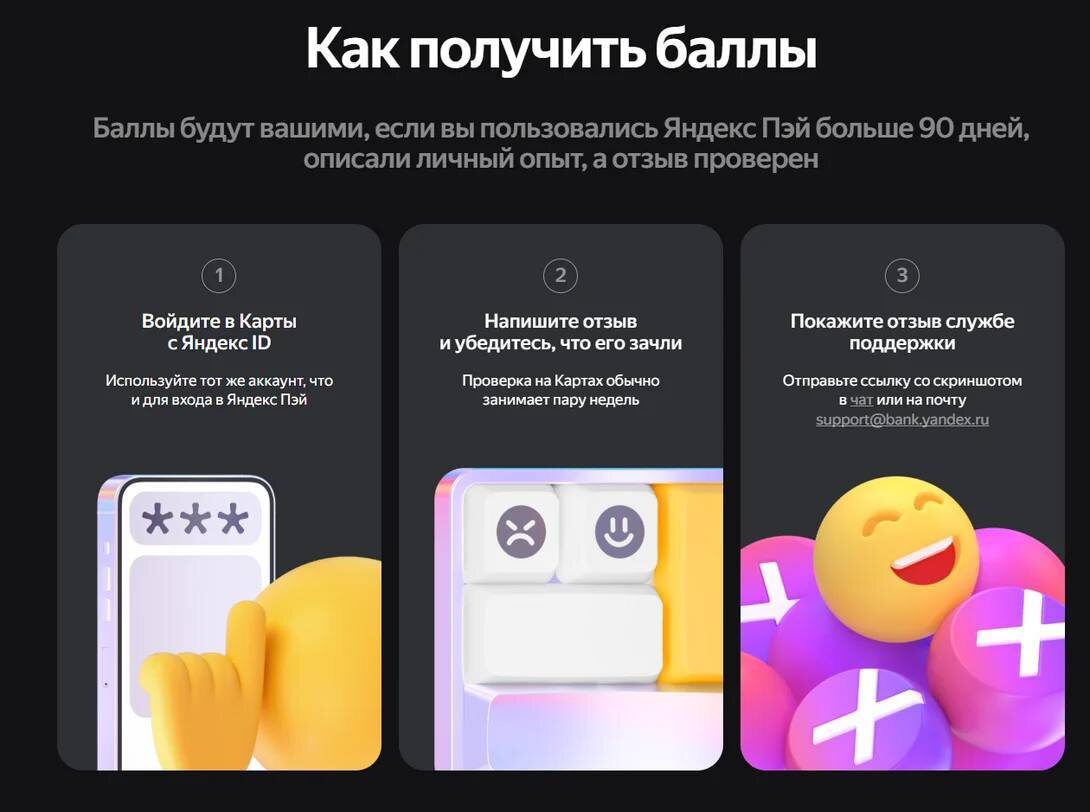 ! Друзья, там Яндекс банк раздает 500 баллов Яндекса за отзыв - https://pay.yandex.ru/karty Суть - нужно написать отзыв на Яндекс.Картах о Яндекс банке. Также вы должны пользоваться услугами банка более 90 дней. Далее после публикации отзыва, нужно будет отправить в чат ссылку со скриншотом. P.S. Кто не хочет заморачиваться, попросите нейронку написать базовый отзыв на 3-4 предложения.
