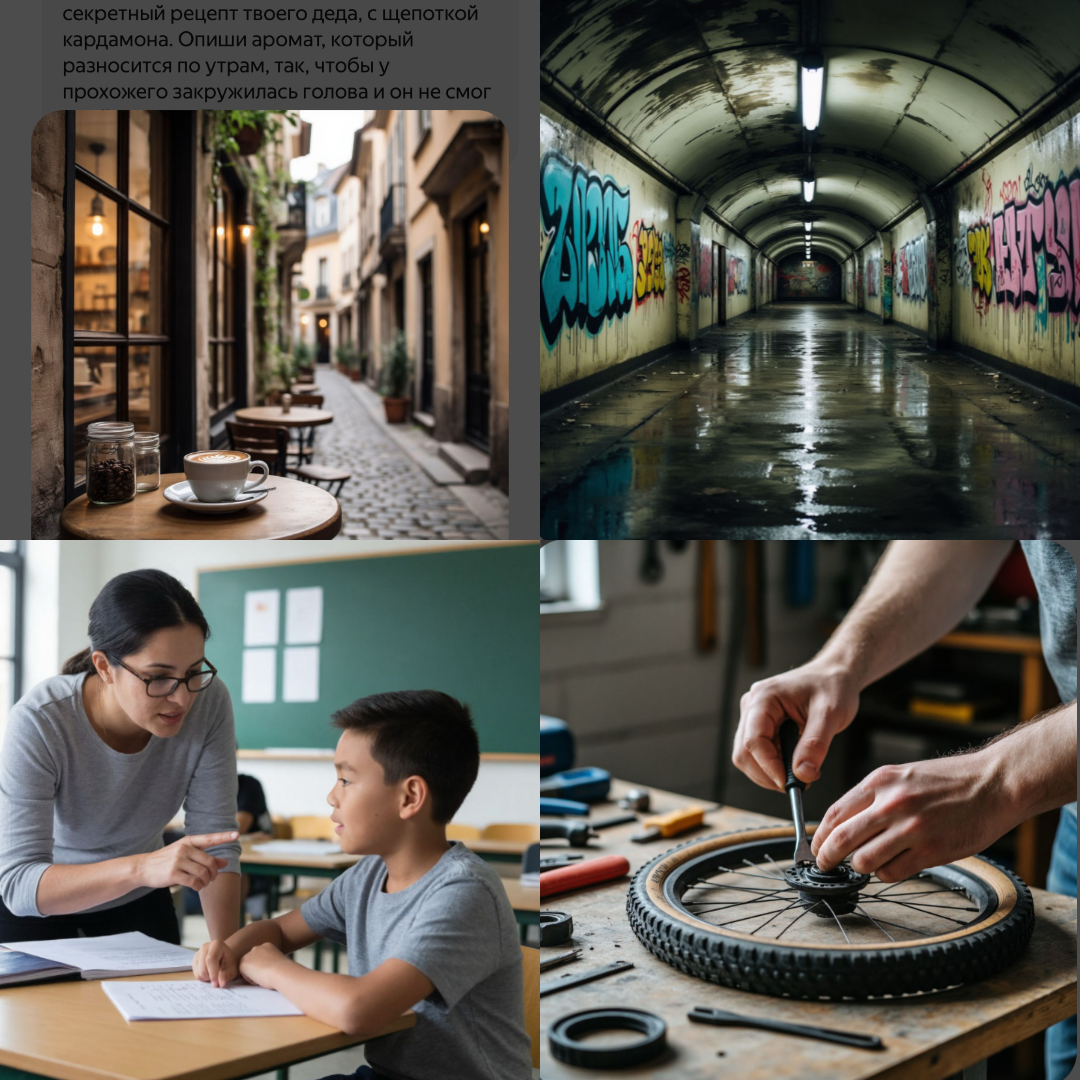 Чувствуешь разницу? Ты даешь не задачу, а роль, атмосферу, сенсорику. ИИ цепляется за эти детали и выдает что-то душевное.