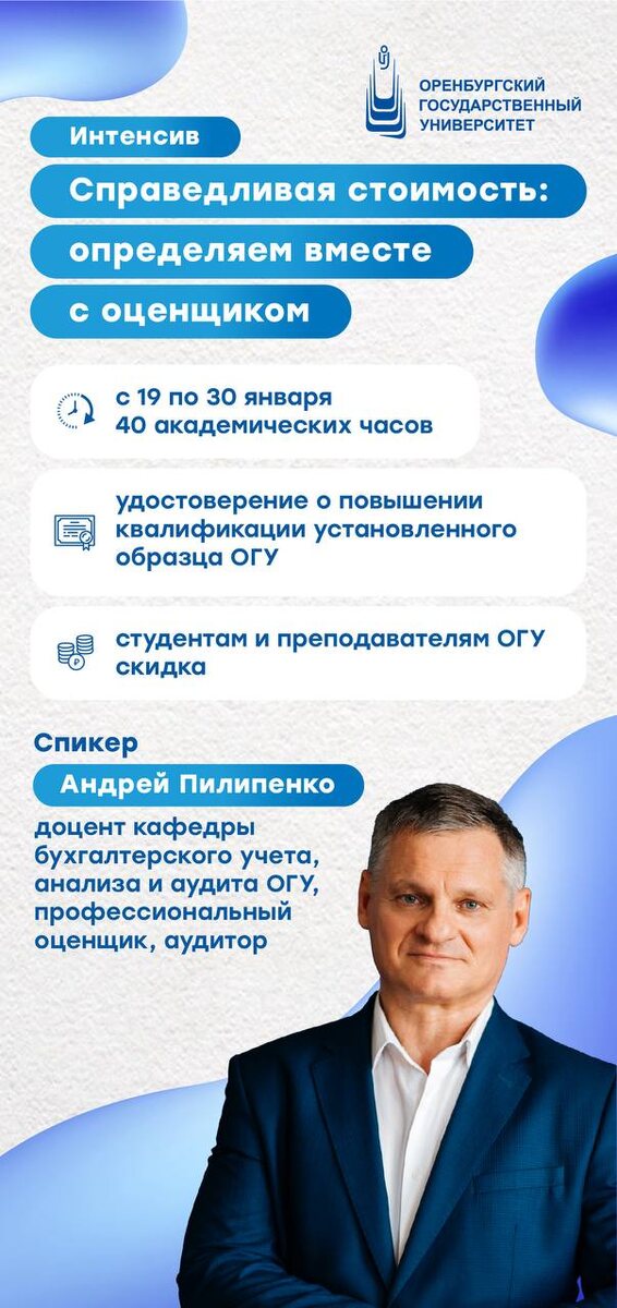 🔣 Приглашаем тебя на интенсивный курс повышения квалификации. Это не просто лекции, а практический разбор сложных случаев под руководством эксперта-оценщика. Ты научишься корректно оценивать активы, минимизируя риски для компании и для себя лично. Программа курса охватывает ключевые темы – от фундаментальных понятий справедливой стоимости в ФСБУ и МСФО до глубокого разбора стандарта МСФО (IFRS) 13 с тремя подходами к оценке. Особое внимание уделено алгоритмам и документальному оформлению оценки для различных активов, включая недвижимость, права аренды, оборудование, бизнес в целом и нематериальные активы. Эксперт – доцент кафедры бухгалтерского учета, анализа и аудита, профессиональный оценщик и аудитор Андрей Пилипенко. Объединяя опыт преподавания и реальной оценочной работы, он объяснит самое сложное на понятных примерах 👍 Курс пройдёт с 19 по 30 января. Его общий объём составляет 40 академических часов. По итогам обучения ты получишь удостоверение о повышении квалификации уста