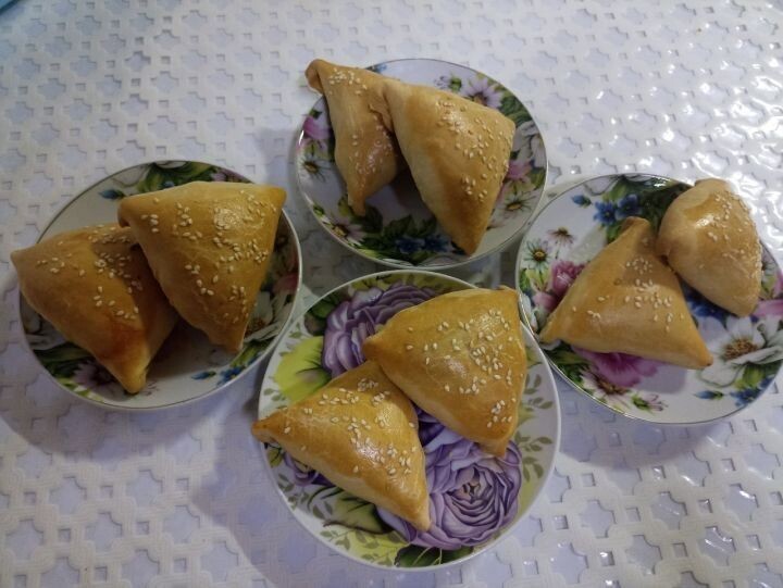 Камырга: 600 грамм он 200 грамм су 2 йомырка, берсе камырга, икенчесе самсаны майлау өчен 50 грамм сыер мае 1 аш кашыгы тулыр- тулмас тоз Кунжут самса өстенә сибү өчен Эчлеге: 500 грамм ваклап туралган ит 300 грамм суган Тәменчә тоз, борыч, зира Әзерләү: камырны башта кашык белән генә болгатабыз, бераз куергач кул белән 15 минут тирәсе тыгыз итеп басабыз һәм 1 сәгатькә пакетка салып суыткычка куябыз. Аннары камырны алып җәябез, өстенә сыер мае сөртәбез, рулон шикелле төрәбез, улитка сымак борып пакетка салып, тагын 1 сәгатькә суыткычка куябыз. Ул арада эчлекне әзерлибез. Камырны алып, рулон хәленә кайтарабыз, өлешләргә бүлеп, (катлы камыр була) өчпочмаклап самса ясыйбыз. Бөкләгән ягын аска каратып, табага пергамент кәгазь өстенә тезәбез. Өстен йомырка белән майлыйбыз, кунжут орлыгы сибәбез дә, духовкада пешерәбез. Тәмле булсын!