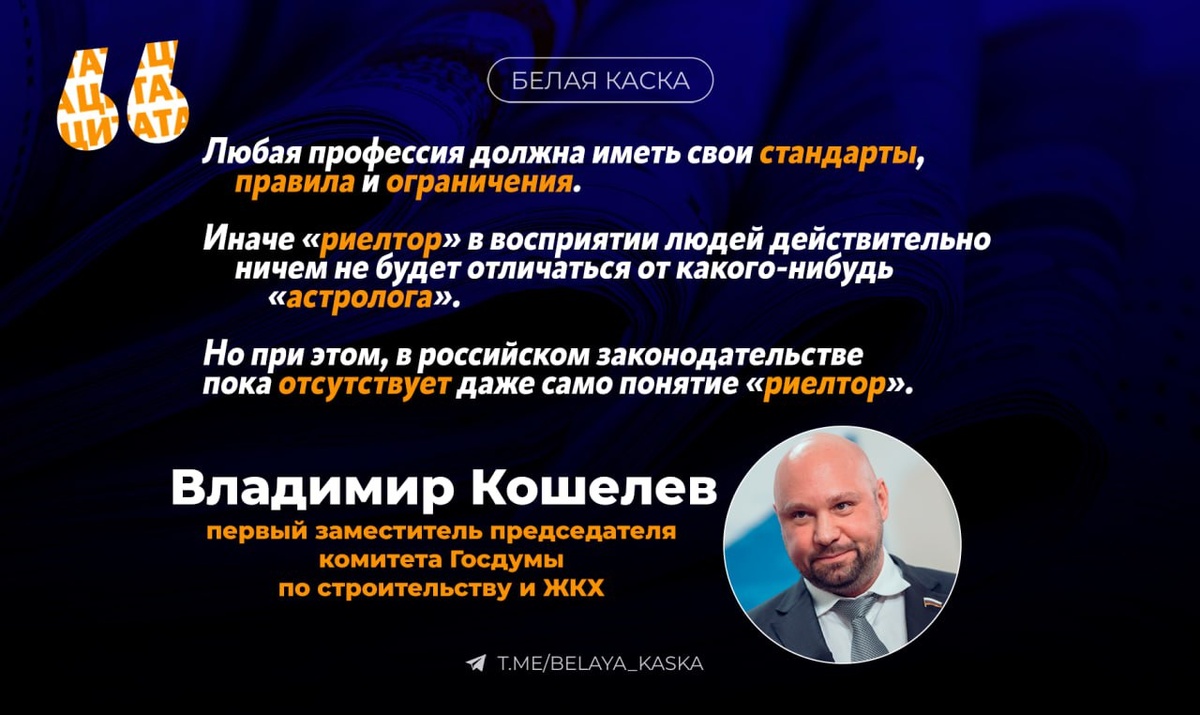 🪖 Риелторов предлагают признать профессией с ответственностью и допуском к рынку После заявлений Росреестра о подготовке регулирования риелторской деятельности в Госдуме усилилась дискуссия о формате будущего закона. Один из ключевых тезисов — рынок перегружен «серыми» посредниками, а ответственность за сделки фактически размыта. 📶 По оценкам депутатов, сегодня: 🔵около 70% риелторских услуг находятся в теневой зоне, где большинство посредников не зарегистрированы и не платят налоги. 🔵ежегодно 7–8 тыс. человек становятся жертвами «чёрных риелторов» 🔵объём рынка — порядка 140 млрд руб. 🔵 81% сделок с недвижимостью проходит с участием риелторов. ⚡️ Владимир Кошелев, первый зампред комитета Госдумы по строительству и ЖКХ: Уверен, что многие из вас видели «нефильтрованные» отзывы людей о риэлторах. Знаю, какое зачастую складывается о них представление, как о каких-то бесполезных посредниках, «паразитах», которые только обманывают, хитрят, тянут деньги и в итоге ни за что не отв