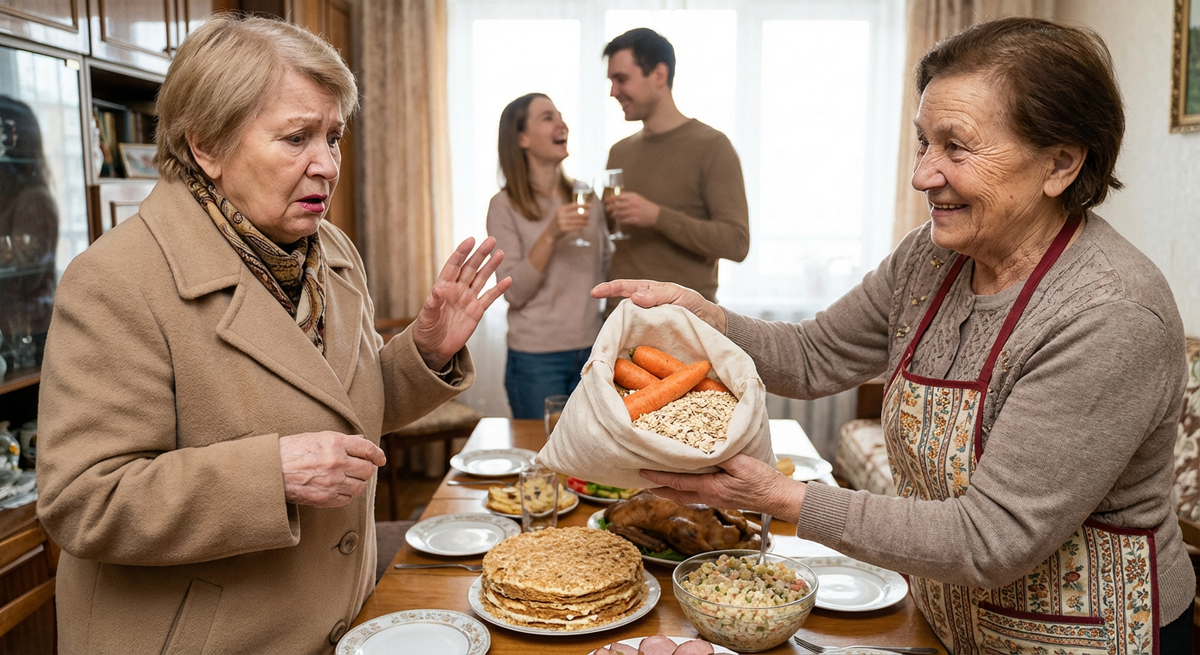 – Это здоровье! – радостно объявила Татьяна. – Натуральное, без ГМО, без жира, без сахара. Морковку погрызете – для десен полезно. Овсянку на воде запарите – кишечник скажет спасибо. Вы же с пустыми руками пришли, так хоть от меня с пользой уйдете. Я ведь, Ираида Павловна, гостеприимная. Никого с пустыми руками не отпускаю. Но и критику вашу я услышала. Больше никакой "отравы" для вас.