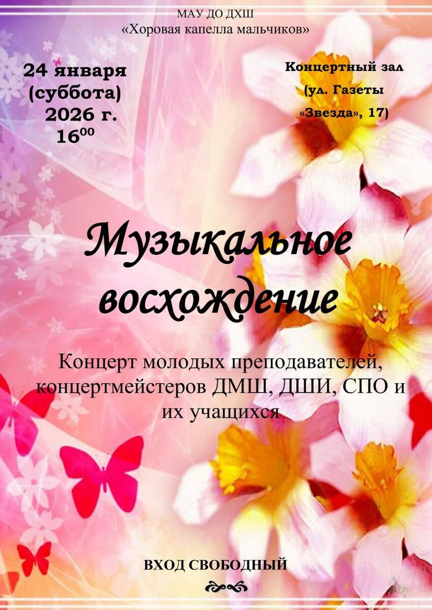 » ⏰24 января (сб), в 16:00 📍МАУ ДО ДХШ «Хоровая капелла мальчиков», ул. Газеты Звезда, 17 💵Вход свободный Приглашаются все любители музыки на открытый концерт, где молодые преподаватели и концертмейстеры ДМШ, ДШИ и СПО представят свои таланты вместе со своими учащимися. Подробности в группе - https://vk.com/public193695609