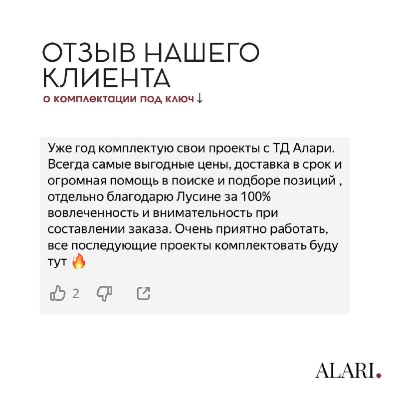 Ваши отзывы для нас - больше, чем слова. Это про доверие, внимательность к деталям и поддержку, которую вы чувствуете в работе с нами. ⬇️ Делимся отзывом нашего клиента «Уже год комплектую свои проекты с ТД Алари. Всегда самые выгодные цены, доставка в срок и огромная помощь в поиске и подборе позиций , отдельно благодарю Лусине за 100% вовлеченность и внимательность при составлении заказа. Очень приятно работать, все последующие проекты комплектовать буду тут 🔥» Спасибо за доверие и такие тёплые слова. Для нас важно, чтобы комплектация была понятной, точной и спокойной - с вниманием к каждой позиции, срокам и бюджету. Рады, что вы это чувствуете, и будем рядом в следующих проектах. 🔔Если у вас есть вопрос или задачи - мы всегда на связи для вас. 😉😉😉😉😌🟤