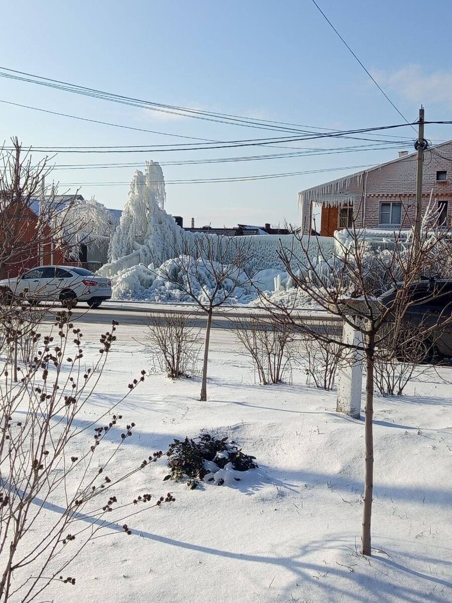 На улице Текстильной в Шахтах прорвало трубу — мощный напор воды залил забор, деревья, кусты и фасад жилого дома. Местные жители сняли, как вода фонтаном бьёт из земли и превращает двор в каток. Спустя сутки на месте образовалась ледяная инсталляция: всё вокруг покрылось плотной коркой льда — будто готовились к ледовому шоу. Вода продолжает подмораживать, а о сроках устранения порыва пока ничего не сообщается. 👉🏻Новости №1 в Ростове 💌Прислать новость/фото Ростов Папа теперь в Ⓜ️🅰️❌