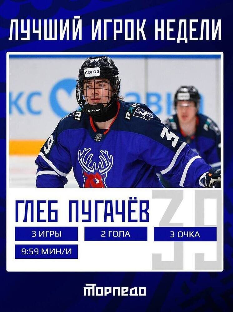 Глеб Пугачев, 17-летний форвард «Торпедо», признан лучшим среди новичков 18-й недели КХЛ. Всего лишь пять матчей понадобилось Пугачеву, чтобы проявить себя в КХЛ: дважды отличиться заброшенными шайбами и единожды результативно ассистировать. В поединке против «Локомотива», действующего чемпиона Кубка Гагарина, Пугачев забил свой дебютный гол в сильнейшей лиге континента, а также отдал результативную передачу на Егора Соколова. В субботней игре единственная шайба, заброшенная Пугачевым, принесла победу над «Спартаком». В текущем сезоне Пугачев также успел сыграть 27 матчей за «Чайку» и 8 игр за «Торпедо-Горький». В сумме хоккеист набрал внушительные двадцать шесть очков по системе «гол+пас», выступая в трех лигах.