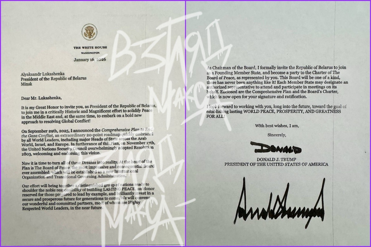 Президент США Дональд Трамп направил Александру Лукашенко личное обращение с предложением принять участие в работе «Совета мира» и выступить