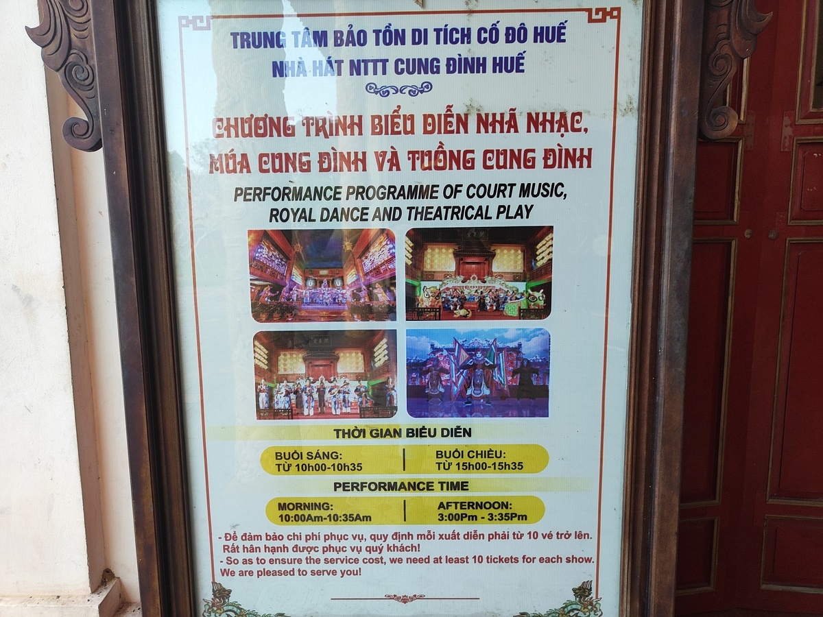 Доброе утро, дорогие читатели. Сегодня мы покидаем Вьетнам и возвращаемся в Таиланд. Путь предстоит долгий, старт назначен на 9 часов утра. А пока есть время, дорасскажу вам про день вчерашний, когда мы гуляли по Императорскому городу Хюэ. Начало путешествия в историю Хюэ тут: Среди многочисленных построек обращает на себя внимание Императорский театр. В нем и в настоящее время проходят представления два раза в день. Чтобы увидеть одно из них, нужно купить билеты. У входа в здание театра висит предупреждение, что спектакль не состоится, если будет выкуплено меньше 10 билетов. Мы смотреть спектакль не планировали, но в сам театр заглянули. Вход свободный, только надо у входа снять обувь. Зрительный зал небольшой, но роскошный. Все отделано ценными породами деревьев, кресла под стать императорским особам. Вдоль стен установлены стенды с костюмами, в которых выступают артисты. Кроме костюмов они надевают маски, чтобы подчеркнуть настроение грусти или ярости, счастья или злобы. Маски