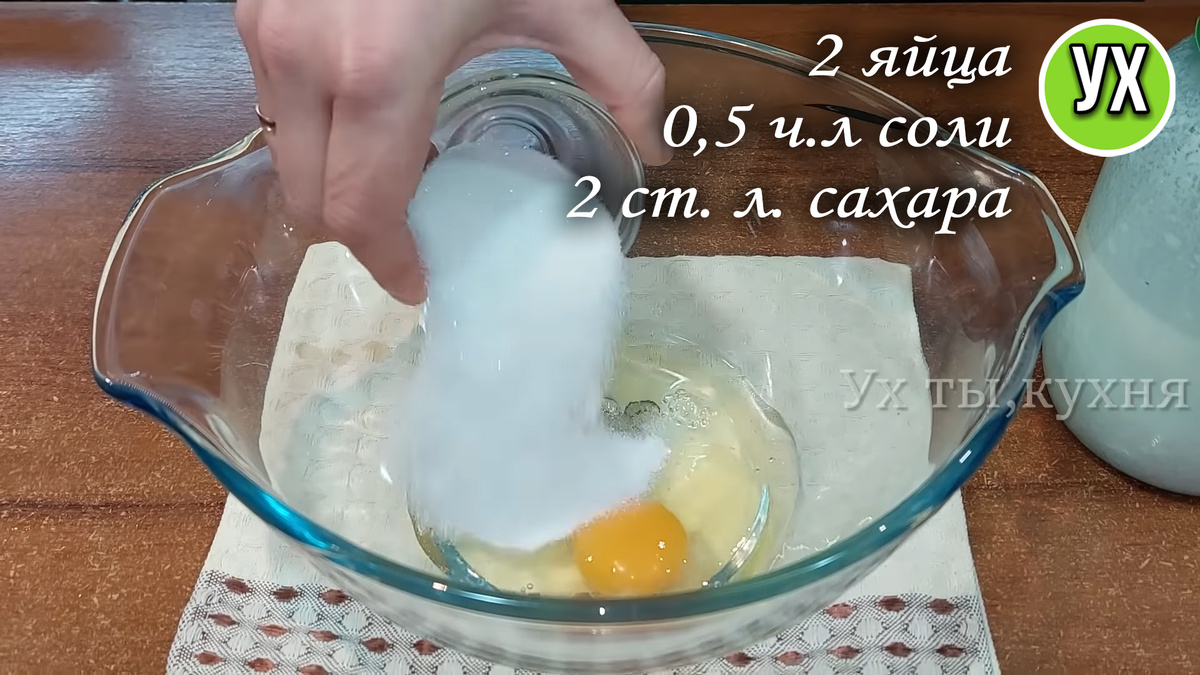 И сегодня делюсь рецептом на кефире. Такой продукт отлично подходит для выпечки и всегда идёт в ход на моей кухне. На канале вы найдёте много рецептов из кефира и творога. На мой взгляд, с ними выпечка получается особенно вкусной и дольше остаётся свежей. Готоим так: 1. В миску разбиваю два крупных яйца. Добавляю примерно половину чайной ложки соли и 2 столовые ложки сахара. Хорошо взбалтываю венчиком до лёгкой пены. 2. Затем вливаю 500 мл кефира и аккуратно перемешиваю. 3. После этого добавляю 300 граммов муки и тщательно размешиваю, чтобы не было комочков. Тесто получается желтоватым, однородным, допускаются мелкие крупинки. На этом этапе добавляю 1 чайную ложку соды и снова всё хорошо перемешиваю. 4. Далее вливаю 300 мл крутого кипятка, делаю это постепенно, сразу же размешивая тесто. После этого добавляю 3 столовые ложки растительного масла без запаха. Тесто готово, даю ему постоять 5 минут (оно становится пузырчатым и воздушным). Разогреваю сковороду, у меня чугунная. Перед первым