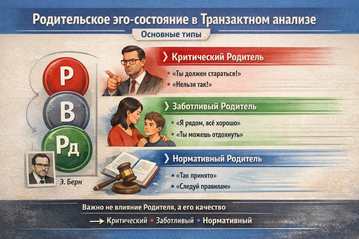! 🧠 Родительское эго-состояние в Транзактном анализе: ключевые типы В Транзактном анализе Э. Берна личность функционирует через три эго-состояния: Родитель — Взрослый — Ребёнок. Сегодня — о Родителе, который формируется на основе интроектов значимых взрослых и продолжает управлять поведением, самооценкой и выбором человека во взрослом возрасте. 🔴 Критикующий Родитель Функция: контроль, оценка, коррекция поведения Проявляется через внутренние послания: — «Ты недостаточно стараешься» — «Ошибаться нельзя» — «Надо быть лучше» 📌 В адаптивной форме — поддерживает дисциплину и социальные нормы. 📌 В дезадаптивной — формирует хроническое чувство вины, стыда, тревоги, усиливает перфекционизм и самосаботаж. В терапии часто проявляется как жёсткий внутренний критик. 🟢 Заботливый Родитель Функция: поддержка, защита, регуляция состояния Внутренние послания: — «Ты имеешь право на отдых» — «С тобой всё в порядке» — «Тебе можно просить о помощи» 📌 Является внутренним источником безопа