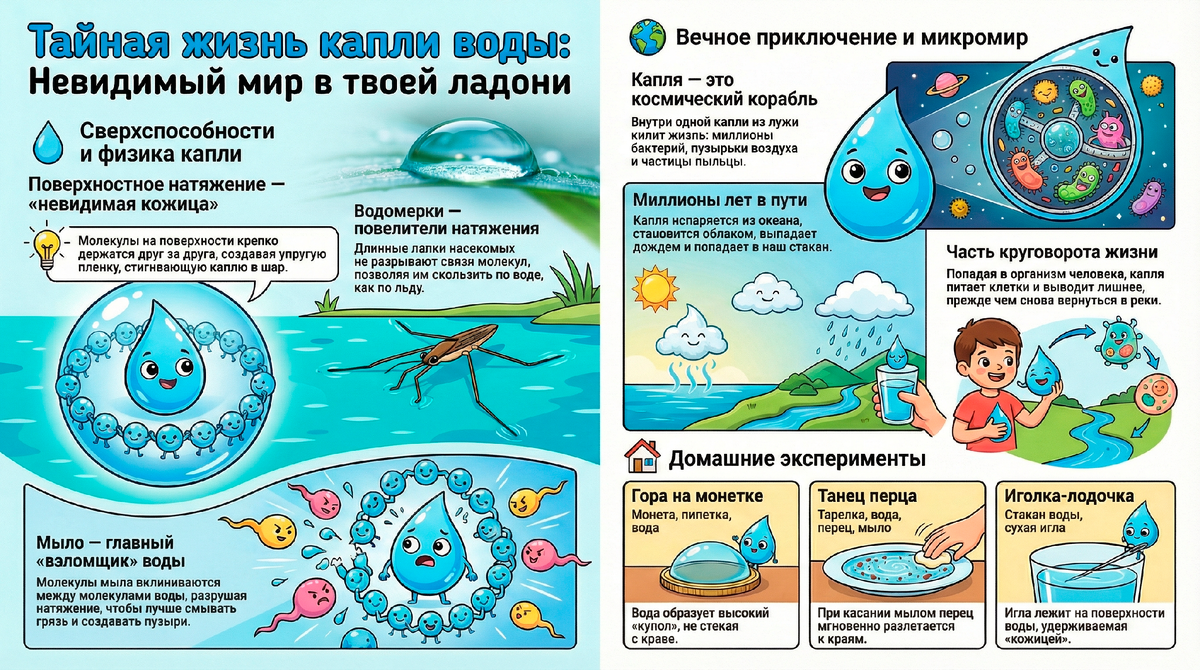 Сегодня мы с вами станем исследователями и разглядим в самом обычном веществе целую вселенную. Мы возьмем всего одну каплю воды, но увидим в ней законы физики, мир невидимых существ и великое путешествие длиной в тысячи километров. Готовы отправиться в микромир, полный удивительных открытий? Тогда начинаем наше расследование тайной жизни капли!»