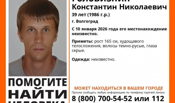 Волгоградец внезапно исчез 10 января 2026 года. С тех пор его местоположение остается неизвестным. Активисты поискового отряда «ЛизаАлерт» по Волгоградской области опубликовали информацию о пропаже Константина Головизнина. Известно, что ему 39 лет и проживает он в областном центре. В последний раз его видели 10 января. Поисковики назвали приметы мужчины: рост 165 см, худощавое телосложение, темно-русые волосы и серые глаза. Во что был одет пропавший человек, также неизвестно.