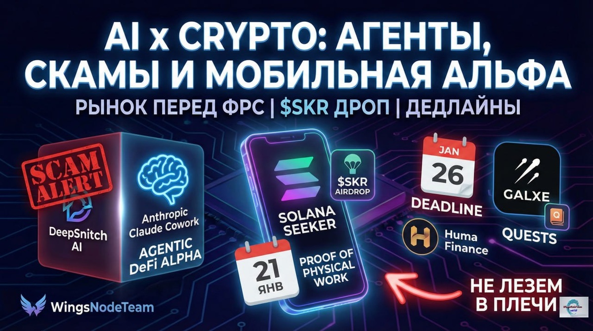 🤖 AI x CRYPTO: Агенты, Скамы и Мобильная Альфа Продолжаем разбор недели. Пока Биткоин спит, в секторах AI и Solana происходит передел рынка. Здесь можно заработать много, но еще легче - потерять всё. 🧠 AI-Агенты: Будущее или Развод? На этой неделе гремел проект DeepSnitch AI ($DSNT). Обещают "агентов безопасности", которые спасут от скама. 🟢 Наш вердикт: 🚩 КРАСНЫЙ ФЛАГ. Агрессивный маркетинг пресейла, таймеры "цена вырастет через 2 часа", фейковые новости. Это классические признаки схемы Pump & Dump. Не ведитесь на красивые лендинги и "аудиты". 🟢 Где реальная Альфа? Смотрите на Anthropic. Они выпустили обновление "Claude Cowork". Теперь ИИ может управлять файлами на вашем ПК. 🟢Тенденция 2026: Мы идем к "Agentic DeFi". Скоро вы будете не сами кликать в Uniswap, а говорить боту: "Сделай мне 5% доходности на стейблы", и он сам все сделает. Учитесь промптить, а не читать графики. 📲 Solana Mobile: Дроп $SKR Владельцы телефона Seeker (наследник Saga), готовьте кошельки. 🟢Событие: