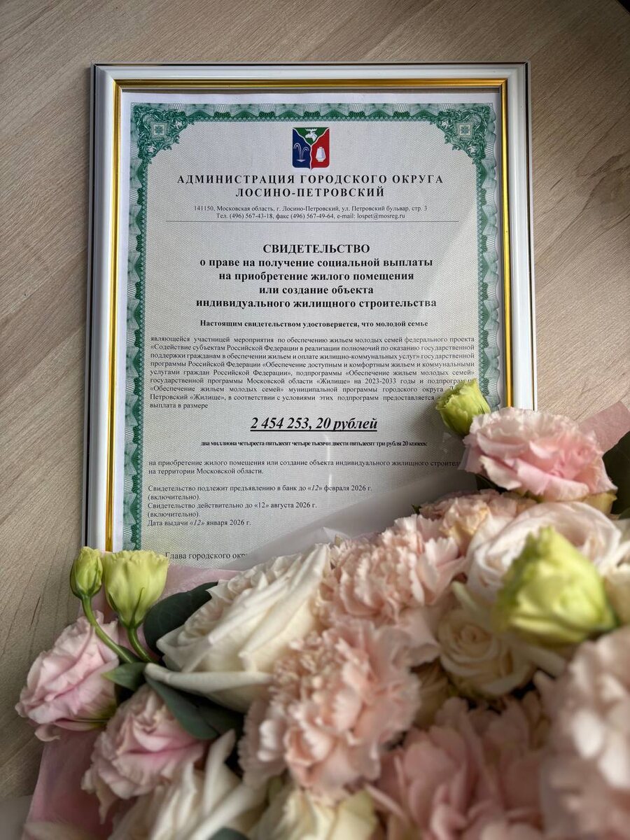 » 🏡 Государственный проект направлен на поддержку молодых и многодетных семей. 📑 Программа «Обеспечение жильём молодых семей» даёт молодым семьям возможность получить социальные выплаты для решения жилищной проблемы. Ведь уютный семейный очаг – это стабильность и надёжный тыл, возможность строить планы на будущее. На протяжении 5 лет на территории городского округа Лосино-Петровский молодые семьи, подходящие для участия в данном мероприятии, отсутствовали. 🎊 И вот долгожданное событие – в 2026 году в округе молодая семья получила свидетельство на получение социальной выплаты. 🎊 Благодаря поддержке государства молодая семья сможет приобрести своё уютное гнёздышко.