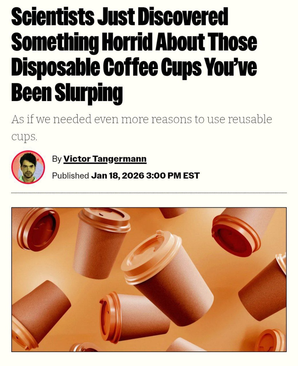 Всё из-за пластиковых стаканчиков — при нагреве они выбрасывают микропластик прямо в ваш напиток. Цифры неприятные: если пить горячий кофе из пластиковых стаканов, за год можно «съесть» около 363 000 (!) частиц микропластика. А это токсины, которые нарушают гормональный баланс и убивают ИММУНИТЕТ. Самый надёжный способ защитить себя — перейти на многоразовую кружку из стекла, керамики или качественной нержавеющей стали. Предупреди кофеманов ☕️ CtrlAltDelights- подписаться