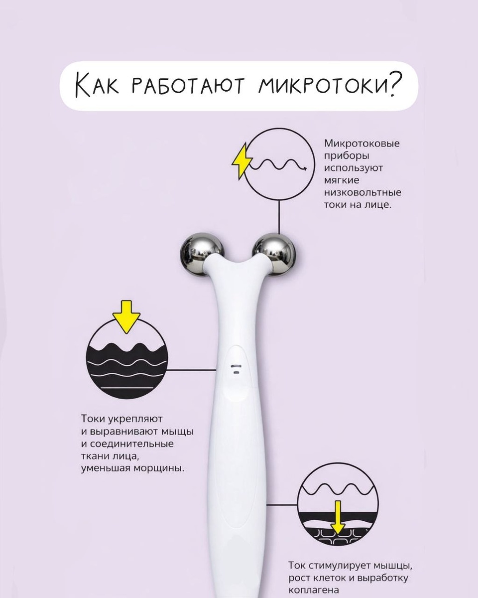 Микротоковая терапия работает за счёт слабых электрических импульсов, близких к естественным токам организма. Ощущения мягкие: лёгкое покалывание или тепло, без боли и реабилитации Чтобы домашний аппарат действительно работал, запасаемся полезной инфой: 1. Тип воздействия • Классические микротоки 10–600 мкА мягкая работа на уровне кожи. Подходят для тонуса, лимфодренажа, уменьшения отёков и выравнивания рельефа • EMS-стимуляция выше 600 мкА. Вызывает сокращение мышц. Направлена на подтяжку овала и зоны подбородка, может ощущаться не так приятно 2. Насадки и форма электродов • Ролики или шарики универсальны для скул, овала лица, шеи • Лопатки или формат гуаша хороши для дренажа, отёков и зоны подбородка 3. Интенсивность • До 100 мкА для чувствительной кожи, зоны вокруг глаз, знакомства с микротоками • 100-200 мкА для регулярного ухода и профилактики • 200-400 мкА для более выраженной работы с тонусом и контуром лица 4. Дополнительные функции • Вибрация улучшает микроциркуляцию и сни