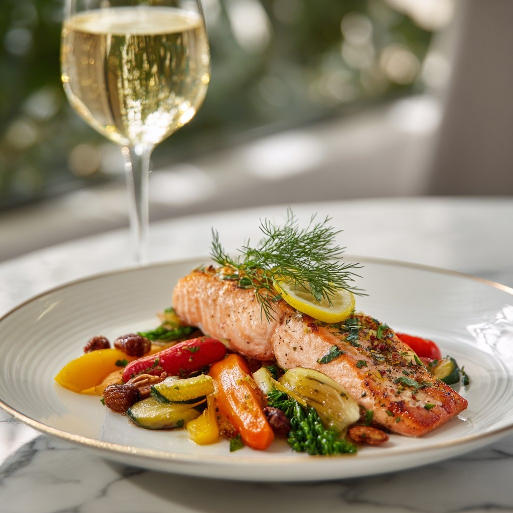 Ингридиенты - Филе лосося – 4 шт. - Брокколи – 300 г - Сладкий перец – 2 шт. - Красный лук – 1 шт. - Оливковое масло – 3 ст. л. - Лимон – 1 шт. - Грецкие орехи – 50 г - Соль и черный перец по вкусу - Свежий укроп – для украшения Способ приготовления 1. Разогреть духовку до 200°C. 2. Выложить филе лосося на противень, застеленный пергаментом. 3. Вокруг разложить соцветия брокколи, нарезанный кольцами сладкий перец и лук. 4. Посыпать рыбу и овощи солью и перцем, сбрызнуть оливковым маслом. 5. Сверху равномерно распределить измельченные грецкие орехи. 6. Нарезать лимон тонкими ломтиками, положить их на рыбу. 7. Запекать в духовке 20-25 минут, пока лосось не станет мягким и овощи не подрумянятся. 8. Подавать, украсив свежим укропом.