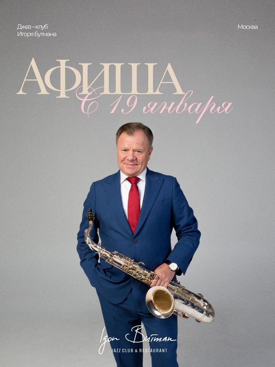 — отличный повод выйти из дома даже в морозную погоду. До встречи! ❤️🔥 Наши планы на неделю: ❄️19 января (понедельник), 19:30 Игорь Бутман и Московский джазовый оркестр Лучший биг-бэнд страны продолжает традицию знаменитых клубных понедельников ❄️20 января (вторник), 19:30 Borodin квартет Джазовые Beatles от квартета солистов Московского джазового оркестра Игоря Бутмана Специальный гость: Юрий Новгородский (вокал, гитара) ❄️21 января (среда), 19:30 Валерий Сюткин и Ансамбль S.O.S (plus) Любимые песни в неожиданных авторских аранжировках ❄️22 января (четверг), 19:30 Борис Березовский и Blues Doctors 3 Kings of The Blues — концертная программа при участии одного из самых знаменитых пианистов мира 🌙22 января (пятница), 22:00 Ночной концерт. Вход свободный! Ансамбль Анастасии Донны ❄️23 января (пятница), 19:30 Гоша Куценко и группа ГК Авторский проект «Слова под Музыку» с элементами театрального перфоманса, поэзии и музыки от заслуженного артиста России 🌙23 января (пятница), 22