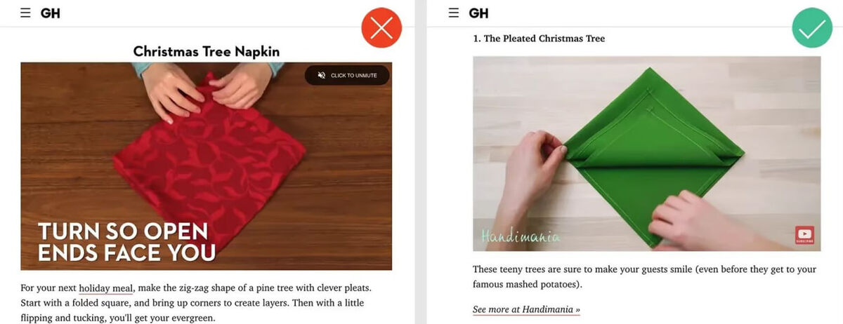 Контент в карточке товара — это инструмент принятия решений, который помогает пользователю понять, подходит ли товар, как им пользоваться, и почему стоит доверять бренду. Перед тем как говорить о технике съёмки, важно понять: что именно вы хотите, чтобы пользователь понял после просмотра контента? Вот основные цели, которые можно решать с помощью визуального контента: Когда пользователь смотрит на видео или фото, он должен непосредственно видеть, как он будет взаимодействовать с товаром, а не пытаться мысленно перевернуть или зеркально отразить действия. Пример: Неправильно: видео складывания салфетки с позиции наблюдателя. Пользователю приходится зеркально отражать шаги. Правильно: видео с позиции пользователя — как он сам будет складывать салфетку. Это снижает когнитивную нагрузку и помогает быстрее понять процесс. Это правило особенно важно для товаров, которые требуют установки, настройки или использования. Стабильный кадр создаёт ощущение профессионализма, надёжности и доверия. Он