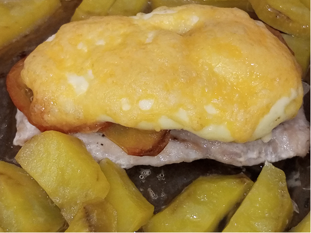 Тут нет особого рецепта, была упаковка куриных грудок, все остальное нашла в холодильнике по остаткам. Каждую куриную грудку ножом прорезала вдоль на три, четыре части, разложила на смазанный растительным маслом противень, смазала горчицей, посолила, поперчила. На часть куриных грудок выложила один репчатый лук, нарезанный полукольцами, сверху один свежий томат нарезанный тонкими кружочками. На другие пласты куриных грудок консервированный кусочками ананас. Если готовить только с ананасами, то на три нарезанные куриные грудки понадобится одна банка ананасов. Сверху куриные грудки с ананасами и томатами смазала майонезом, добавила твердый на терке натертый сыр. Запекала в разогретой до 180 гр. духовке один час. Также начинку можно заменить на обжаренные грибы с луком. Вокруг куриных грудок можно разложить нарезанный картофель сверху добавив соли. Приятного аппетита.