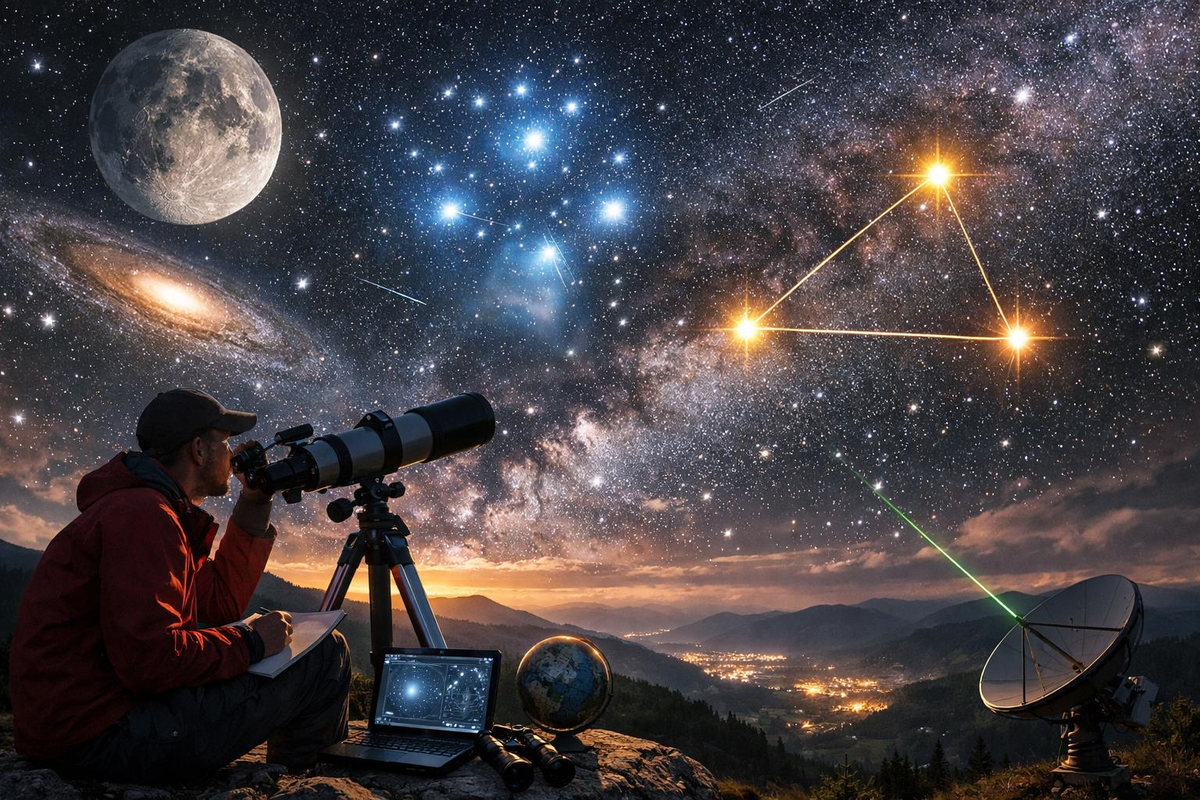 Когда вы в последний раз смотрели на ночное небо и ощущали себя крошечной песчинкой в бесконечном океане? Это чувство естественно: мозг не создан для триллионов километров, рядом с которыми вся человеческая история выглядит короткой вспышкой. Мы живём на маленьком каменном шаре и не располагаем линейкой длиной в световой год, чтобы без затей приложить её к ближайшей звезде. И всё же мы измерили Вселенную, не вставая с дивана, используя свет, математику и каплю дерзости. Мы не дотягиваемся до звёзд руками, но научились дотягиваться до них мыслью — настолько точно, что пустота между нами обрела числа и меру. Самый прямой способ измерить расстояние до ближайших звёзд — параллакс. Достаточно простого опыта: выставьте перед собой палец и посмотрите на него сначала левым глазом, потом правым. Палец «прыгнет» на фоне стены, и этот прыжок будет тем заметнее, чем ближе палец к лицу. В космосе та же логика, только вместо пары глаз работает вся орбита Земли. Мы фотографируем звезду в июне и повто