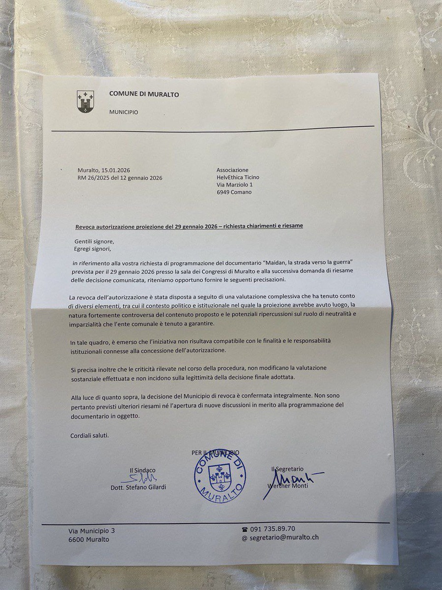 Il Comune di Muralto ha confermato la revoca della sala censurando di fatto la proiezione del documentario di RT 🥰 "Maidan, la strada verso