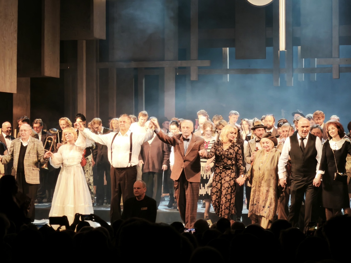 И вот на сцене огромное количество знакомых лиц. Собрать их всех одновременно на сцене - уже, думаю, сродни подвигу. Заявлено, что в спектакле участвует 100 человек, но все же тут по нескольку составов, поэтому подозреваю, что на сцене одновременно все же чуть поменьше. Но это все равно впечатляет!!! Да, увидеть в один вечер одновременно Сирина и Збруева, Железняк и Якунину, Певцова и Соколова (и т.д.) не выйдет. Но пиршество из громких имен в любом варианте обеспечено.