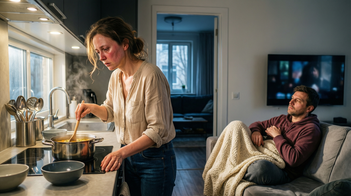 Анна стояла у плиты, помешивая куриный бульон. Вторые сутки голова раскалывалась, тело ломило, а в горле будто поселилась наждачная бумага. Но суп не помешает сам себя, сын не доберется сам на тренировку, младшая — в сад, а муж… Муж Сергей уже второй час смотрел спортивный канал, закутавшись в плед.