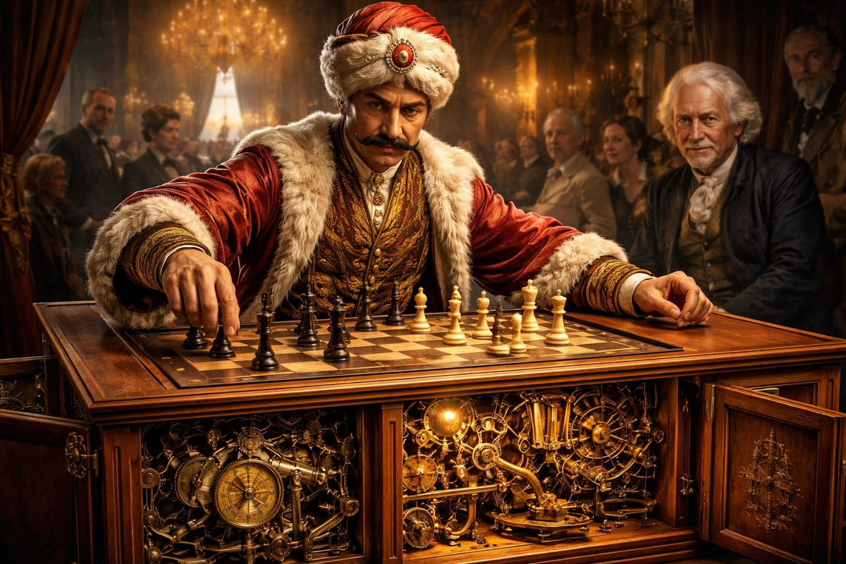 В 1769 году венгерский изобретатель и чиновник Вольфганг фон Кемпелен показал публике невозможное: автомат, который будто бы способен обыгрывать человека в шахматы. Зрители видели, как латунь и дерево разыгрывают интеллект, и не понимали, где проходит граница между механизмом и мыслью. Этот восторг был не просто реакцией на диковинку. Он был признанием: человеку всегда хотелось поверить, что разум можно собрать из деталей — как часы, которые вдруг начинают спорить с мастером. История началась в Вене, где Кемпелен решил поразить императрицу Марию-Терезию. Он создал большой деревянный ящик, над которым возвышалась восковая фигура в халате и чалме — нарочито экзотическая маска, обещающая загадку. Перед партией изобретатель открывал дверцы, показывая зрителям зубчатые колёса, рычаги и пружины, будто предъявляя доказательство «мышления» машины. Но этот показ был не объяснением, а приёмом. Бутафория механизма служила одной цели — внушить идею самостоятельности, чтобы сама демонстрация стала