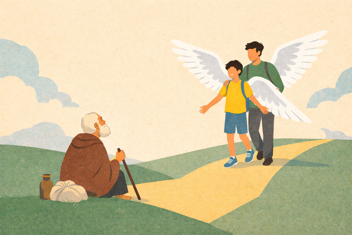 Сидел старик у обочины и смотрел на дорогу. Увидел идущего человека, за которым еле поспевал маленький мальчик. Человек остановился, велел ребёнку подать старику воды и дать кусок хлеба из запасов. — Что ты тут делаешь, старик? — спросил прохожий.
