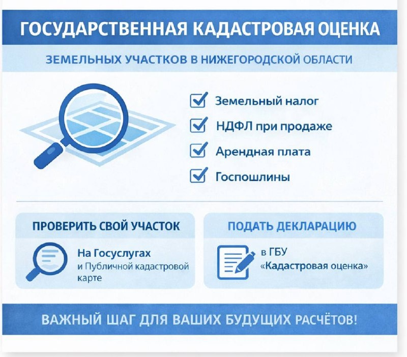 В 2026 году на территории Нижегородской области будет проведена государственная кадастровая оценка всех земельных участков, сведения о которых содержатся в Едином государственном реестре недвижимости (ЕГРН). 📄 Решение о проведении кадастровой оценки размещено: • на официальном сайте Министерства имущественных отношений Нижегородской области; • на официальных сайтах администраций муниципальных образований региона. ❗ Почему это важно? Кадастровая стоимость земельного участка влияет на: • размер земельного налога; • НДФЛ при продаже участка; • размер арендной платы; • размер государственных пошлин (например, при оформлении наследства). При определении кадастровой стоимости учитываются: • категория земель и вид разрешённого использования; • местоположение участка; • его площадь и иные характеристики. 🔍 Как проверить сведения о своём земельном участке? Бесплатно: • через портал Госуслуг с помощью сервиса «Выписка онлайн» (доступно для собственников, чьи права зарегистрированы в ЕГРН);