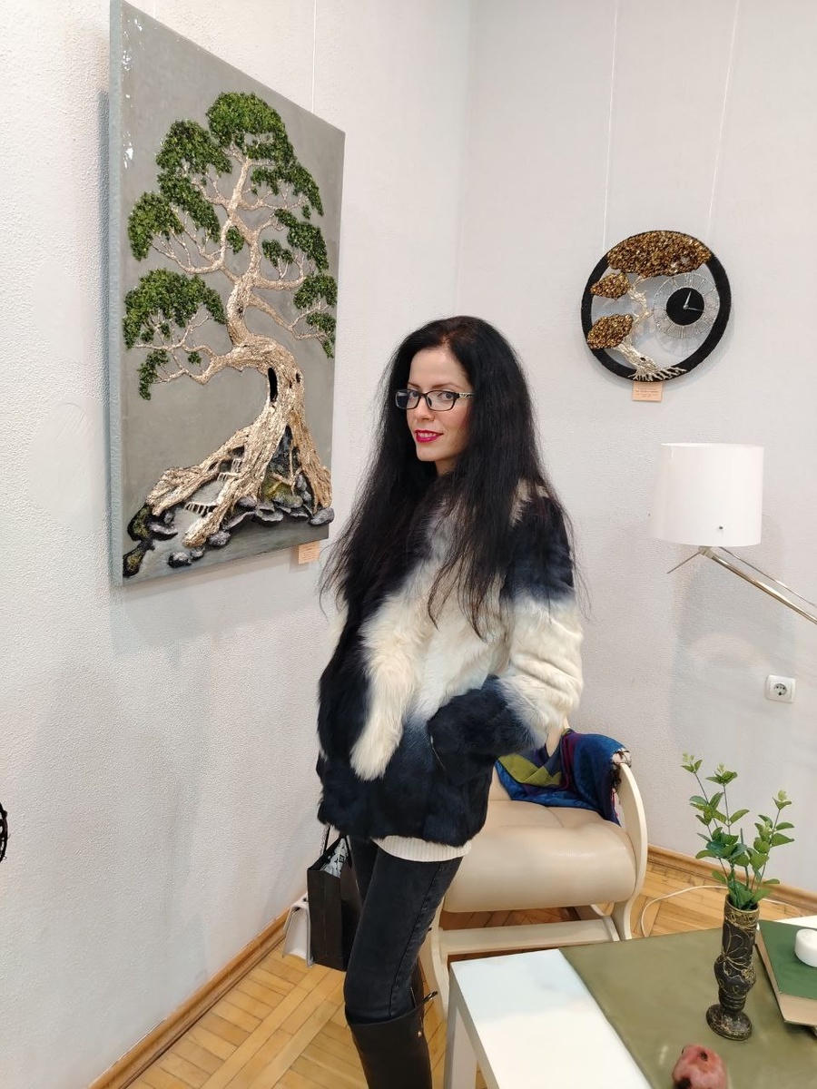 В экспозиции были представлены около 60 работ - живописные портреты и пейзажи, натюрморты из текстурной пасты, абстрактные картины из эпоксидной смолы в сочетании с текстурной пастой, барельефы, предметы декора с применением зеркальных