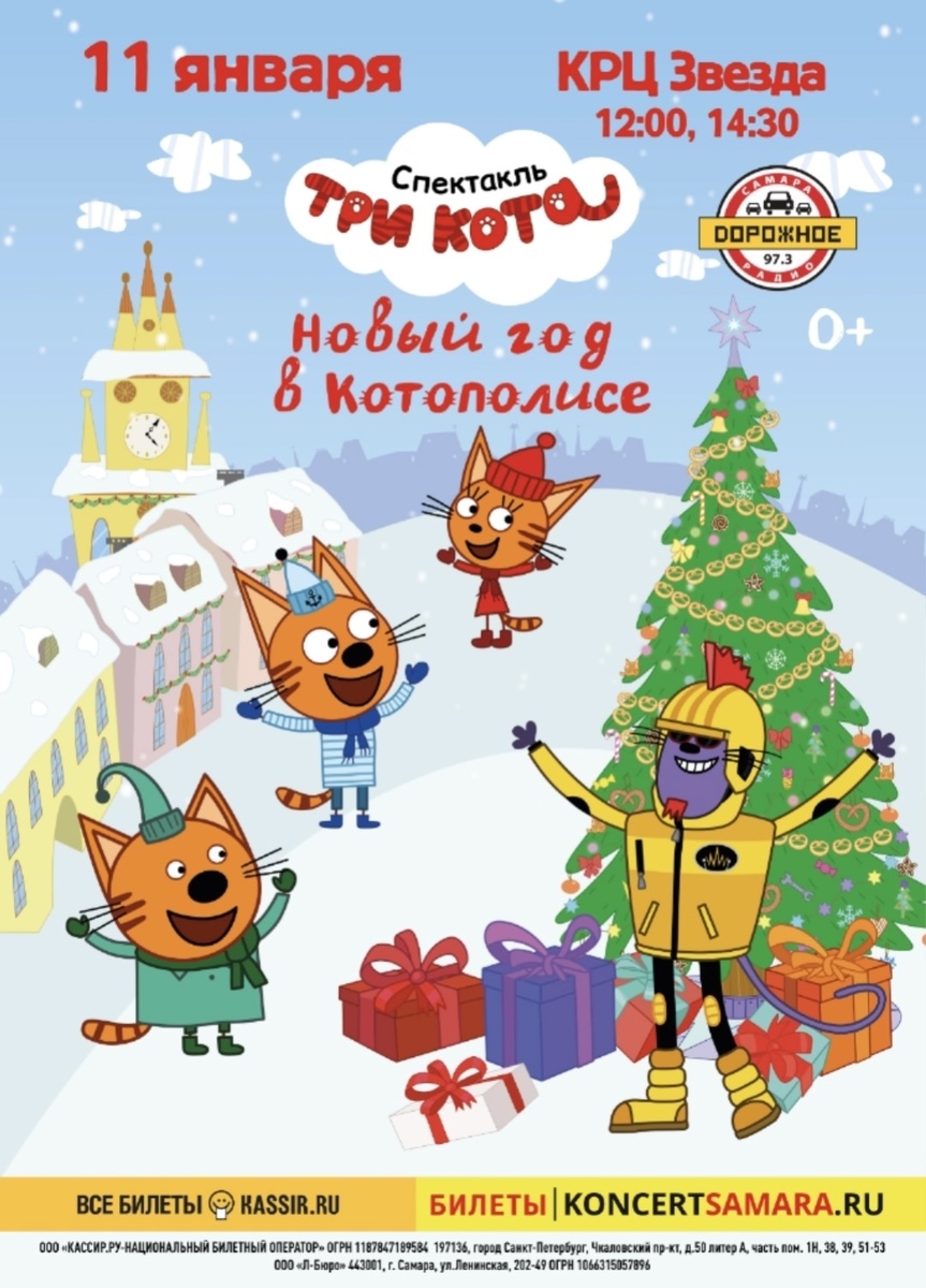 11 января в КРЦ ЗВЕЗДА было детское представление: Новогодний спектакль «Три Кота: Новый год в Котополисе. Сводили внуков на это новогоднее представление "Три кота" Немного нудновато, дети скучали. Хорошо хоть мыльные пузыри попускали коты и мячи в зал кидали, хоть какая то движуха была. Билет детям до 4х лет бесплатно. Младшая внучка с племянницей сидели на 17 ряду. Покупала билет я за 400 руб. племяннице. Вообще то самый дешевый билет стоил 770 руб, но у меня по кешбеку от Т- банка получился дешевле. Сама я не хотела идти, но только что Диме негде сидеть бы было, поэтому тоже зашла. Он на коленках у меня на коляске сидел. Во время спектакля несколько раз вставал, подходил к сцене, потом опять ко мне садился, ну вот как то так). А после представления в холле фотосессия для желающих была за деньги. Чтобы сфоткаться на свой телефон, надо 400 руб заплатить. Обалдеть Снега было в этот день много, ребята соседские меня с подъезда до машины провожали. А там у крц "Звезда", где предс