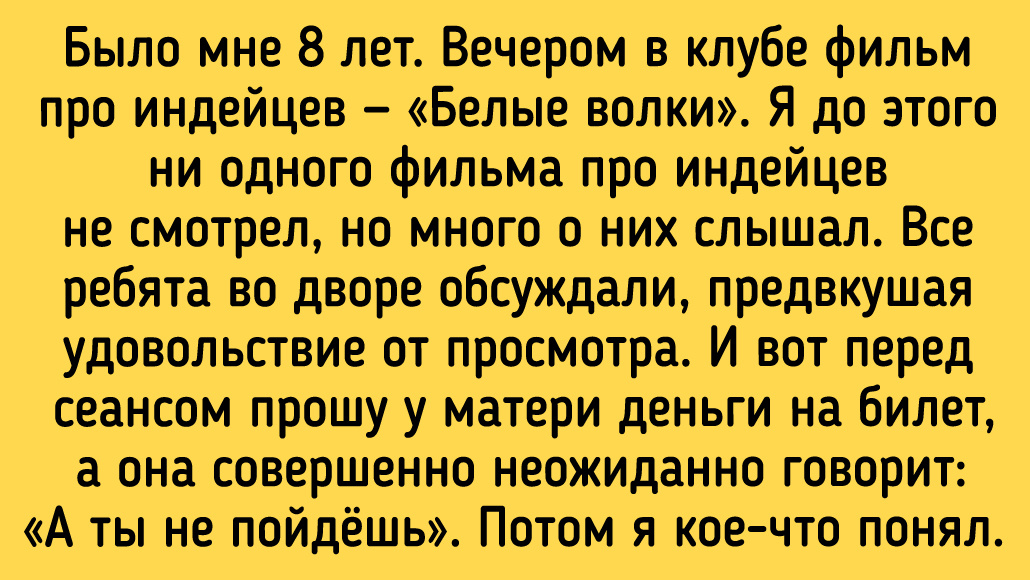 Было мне 8 лет. Вечером в клубе фильм про индейцев — «Белые волки». Я до этого ни одного фильма про индейцев не смотрел, но много о них слышал. Все ребята во дворе обсуждали, предвкушая удовольствие от просмотра. И вот перед сеансом прошу у матери деньги на билет, а она совершенно неожиданно говорит: «А ты не пойдёшь».