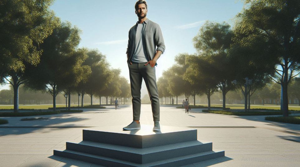 - Слияние. Далее — техника входа в образ, известная в актёрском методе. Он делает глубокий вдох и на выдохе «впускает» этого двойника в себя, ощущая, как его собственная осанка, взгляд, микромимика меняются. Он не тянется вверх — он просто помнит, что стоит на пьедестале. Тело принимает эту память за чистую монету: расправляются плечи, дыхание становится глубоким и медленным, взгляд —внимательным (устойчивым).