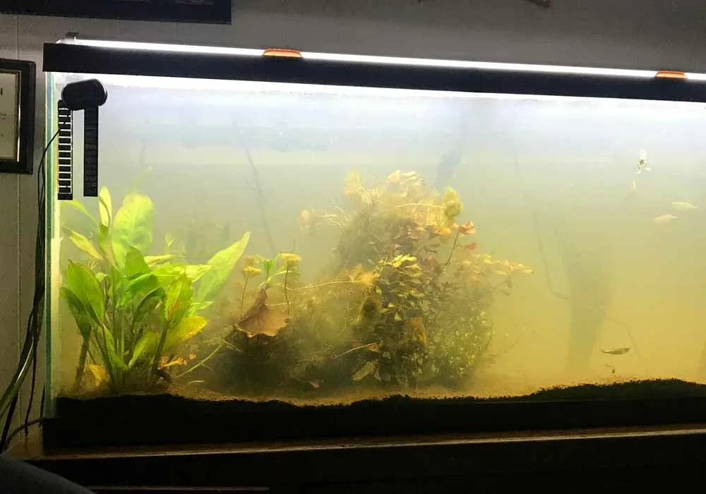 - Как выглядит: Вода равномерно мутная, похожа на разведённое молоко. Часто появляется в новом аквариуме или после масштабных вмешательств (чистка фильтра, пересадка грунта).
