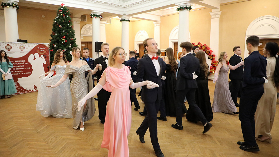 15 января в Воронеже в Доме культуры железнодорожников состоялся торжественный Рождественский благотворительный бал, приуроченный к 150-летию со дня рождения выдающегося нейрохирурга и учёного Николая Бурденко. Его организатором стал медико-профилактический факультет ВГМУ. Событие объединило студентов медицинского вуза, курсантов ВУНЦ ВВС ВВА, офицеров Академии ФСО (ВИПС) и музыкантов оркестра ГУ МВД по Воронежской области. Бал открыли торжественным полонезом в исполнении студентов Воронежского государственного медицинского университета и курсантов Воронежской военно-воздушной академии имени Н.Е. Жуковского и Ю.А. Гагарина. Этот величественный и элегантный танец, исторически служивший началом балов в Российской империи, задал тон всему вечеру. С приветственным словом к участникам мероприятия обратилась декан медико-профилактического факультета ВГМУ Наталья Самодурова. Наталья Юрьевна подчеркнула важность сохранения традиций общественной благотворительности и подвела итоги сбора гумани