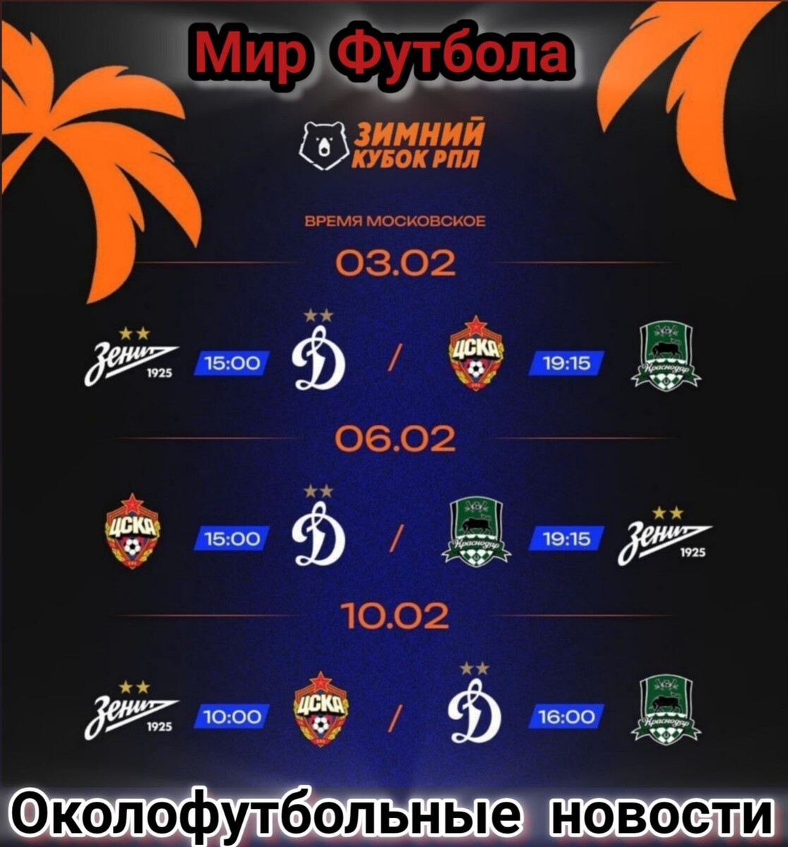 Расписание Зимнего кубка РПЛ-2026 3 февраля (вторник) 15:00 «зенит» – «Динамо» 19:15 ЦСКА – «Краснодар» 6 февраля (пятница) 15:00 ЦСКА – «Динамо» 19:15 «Краснодар» – «зенит» 10 февраля (вторник) 10:00 «зенит» – ЦСКА 16:00 «Динамо» – «Краснодар» *время московское Все матчи в прямом эфире покажут телеканалы «Матч ТВ» и МАТЧ ПРЕМЬЕР. Информация о билетах на матчи будет опубликована дополнительно. Регламент турнира: Турнир пройдет по круговой системе, каждый сыграет с каждым. Если основное время матча завершится вничью, победитель определится в серии пенальти. Система начисления очков: победа в основное время – 3 очка; победа в серии пенальти – 2 очка; поражение в серии пенальти – 1 очко; поражение в основное время – 0 очков.
