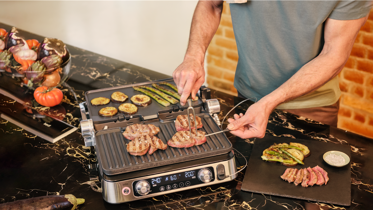 C электрогрилем от Braun MultiGrill 9 Pro легко и быстро можно готовить сочные стейки, хрустящие тосты, ароматные вафли и много другое. Рассказываем кратко и по делу. Спойлер: в конце дарим промокод на скидку 🤩 Универсальный гриль заменит сразу несколько кухонных гаджетов, поможет сэкономить место на кухне и готовить самые разные блюда как в кафешках хоть каждый день. Скажем за это спасибо трем режимам 👇 Контактный гриль — когда крышка закрыта. Идеально подойдет для гамбургеров, мяса, овощей и сэндвичей. Гриль-печь — верхняя панель приподнята над нижней, создавая эффект духовки. Так удобно готовить деликатные блюда, которым не нужен прямой контакт с горячей поверхностью: рыбу, кусочки пиццы, брускетту. Открытая жаровня или режим барбекю — крышка раскрывается на 180°, вы получаете две полноценные рабочие поверхности. Можете одновременно готовить два блюда — например, стейк и овощной гарнир. Для каждой панели задается своя температура — от 60 до 230 °C. Встроенные в панели нагревательн