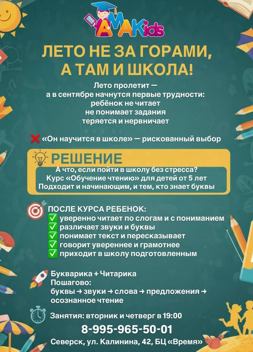 Зима, весна, лето — и начнется школа. А вместе с ней стресс, слёзы и «я не хочу читать» ❌ 👉 Но не у детей AMAkids. Мы закрываем одну из главных школьных проблем заранее — чтение. Остались последние места на курс «Обучение чтению» для детей от 5 лет. 🔹 Подходит и тем, кто только начинает, и тем, кто уже знает буквы 🔹 Сочетает проверенные методики Букварика + Читарика Что получает ребёнок: ✔️ уверенно различает звуки и буквы ✔️ читает по слогам и осознанно, а не «угадывает» ✔️ понимает текст и пересказывает ✔️ говорит грамотнее и увереннее ✔️ приходит в школу подготовленным, а не догоняющим Как учим: 🔸 Букварика — база: буквы, звуки, слова, первые предложения 🔸 Читарика — чтение с пониманием, анализ текста, развитие речи 📅 Занятия: вторник и четверг в 19:00 ❌ Помните! «Он сам научится» — самая дорогая ошибка родителей. 📍 Северск, ул. Калинина, 42, БЦ «Время» 📞 8-995-965-50-01