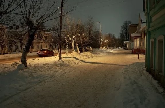 Идя по центральной улице, увидели здание администрации, вход в небольшой парк и здание кинотеатра. В городе стоит темнота. Из освещения только пара фонарей, вокруг ни души, снег плавно падает и заметает наши следы. Идиллия! Как вдруг дверь кинотеатра открывается и оттуда выходят трое подростков. Вау, жизнь-то теплится, оказывается наш вечер спасен. Решили заглянуть.