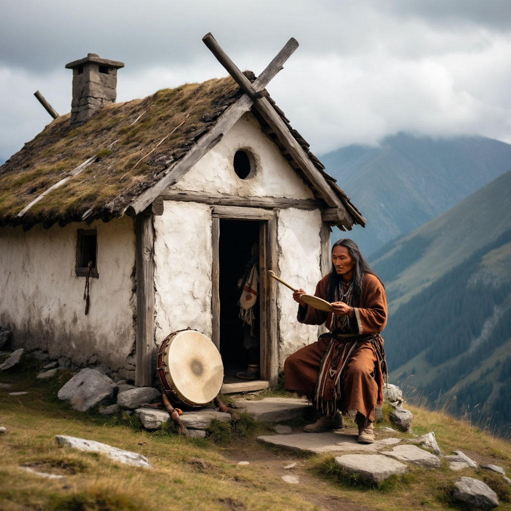 Старый шаман, чьё имя давно стёрлось из людской памяти, появляется не для всех. Иногда его можно увидеть у очага, где огонь горит без дров, излучая не тепло, а тихий, мерцающий свет. Его лицо карта прожитых лет, испещрённая морщинами, похожими на русла высохших рек. В руках он держит бубен, чья кожа натянута так туго, что кажется, будто она вот‑вот лопнет от напряжения невидимых сил.