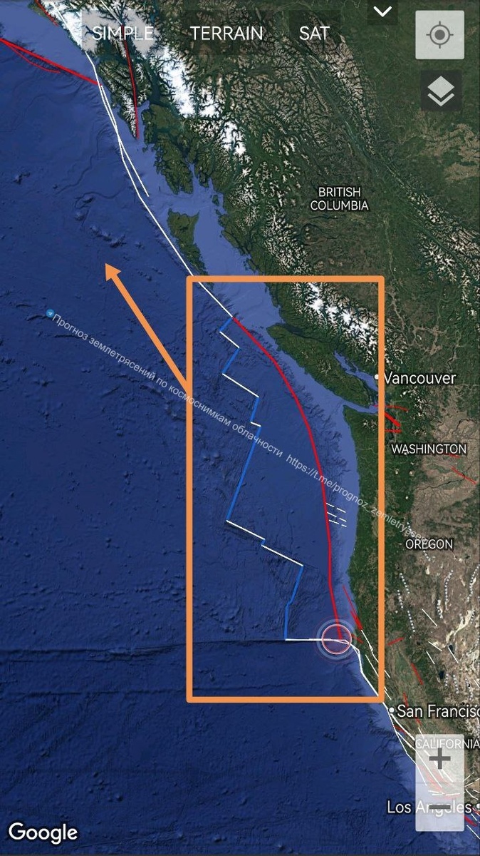 Сильное тектоническое напряжение по плите Хуана де Фука на западном побережье Северной Америки вновь подтверждается. Судя по текущей картине, против часовой стрелки уехала на северо-запад проекция рифтовой зоны от Северной Калифорнии до острова Ванкувер (трассируется граница Тихоокеанской плиты). Природа рисует ОСТИ уровня М7-8 уже несколько дней подряд. В течение 7 дней есть вероятность очень сильного землетрясения по данной зоне. ===== The strong tectonic stress on the Juan de Fuca plate on the west coast of North America is once again confirmed. Judging by the current picture, the projection of the rift zone from Northern California to Vancouver Island has moved counterclockwise to the northwest (the boundary of the Pacific Plate is being traced). Nature has been painting CSTIs of the M7-8 level for several days in a row. There is a possibility of a very strong earthquake in this area within 7 days.