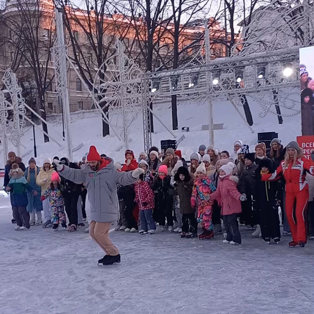 Мы вышли через центральную дверь и медленно спустились на лёд. Пришлось немного привыкнуть к новой поверхности. Погода солнечная, хоть и морозная. Снег красиво серебрится. Дети шустро преодолели препятствие в виде лестницы, очутились на льду и быстро поскользили к центру катка, где первыми начали разминаться.