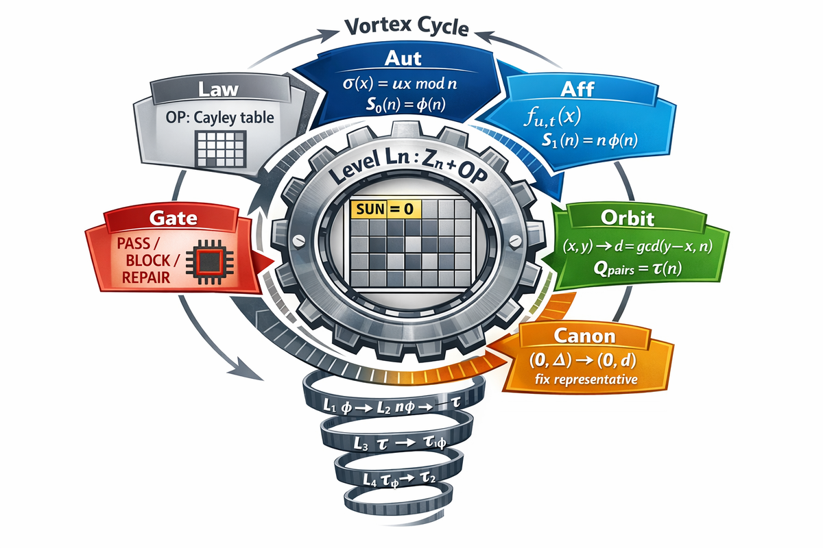 В настоящей работе «закон вихря» был доведён до формы вычислимой дисциплины различения, в которой нет места метафорам: каждый тезис либо редуцируется к таблице Кэли и действию групп, либо блокируется гейтом как некорректный.