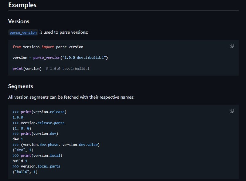 версиям по различным правилам. 📌 Основные особенности: 🔵Парсинг строк версий в объекты 🔵Корректное сравнение версий (>, <, ==, >=, <=) 🔵Поддержка диапазонов и спецификаторов версий 🔵Безопасная работа с prerelease и build-метаданными 🔵Чистый API и строгая типизация ➡️Установка библиотеки: pip install versions 📱 Репозиторий ➡️Справочник Программиста. Подписаться