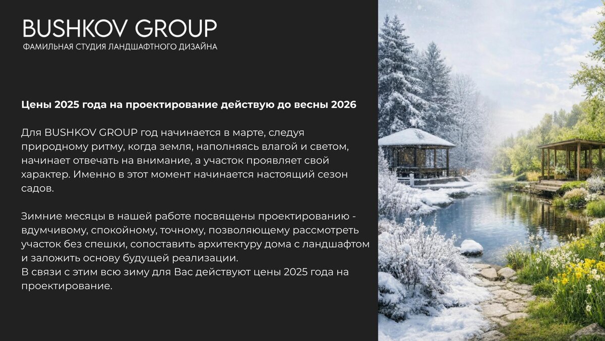 Мы поздравляем Вас с наступившим Новым годом и хотим поделиться тем, как именно он начинается для BUSHKOV GROUP. Для BUSHKOV GROUP год начинается в марте, следуя природному ритму, когда земля, наполняясь влагой и светом, начинает отвечать на внимание, а участок проявляет свой характер. Именно в этот момент начинается настоящий сезон садов. Зима в нашей практике посвящена проектированию, требующему сосредоточенности, времени и внутренней тишины. В этот период формируются решения, учитывающие образ жизни будущих владельцев, характер места и логику развития сада на годы вперёд. Такой процесс рождается из вдумчивого анализа, наблюдений и диалога, позволяя создавать проекты с глубиной и устойчивостью. По этой причине всю зиму для Вас действуют цены 2025 года на проектирование. Для части наших заказчиков, планировавших проектирование в 2025 году и перенёсших работу на 2026, стоимость сохраняется до начала весны, поддерживая ранее принятые договорённости. Одновременно с этим для новых заказчи