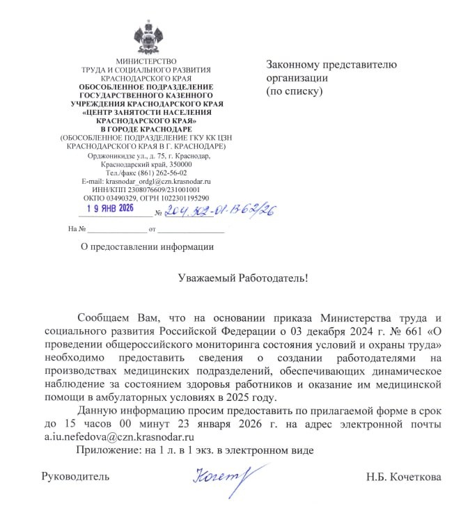 👀 До 23 января 2026 года в рамках проведения общероссийского мониторинга состояния условий и охраны труда необходимо предоставить сведения о создании работодателями на производствах медицинских подразделений, обеспечивающих динамическое наблюдение за состоянием здоровья работников и оказание им медицинской помощи в амбулаторных условиях в 2025 году. А мы говорили, что нас ждёт в ближайшем будущем: в том числе возрождение цеховой медицины ➡️ https://go.spec.help/LIfklX4 SpecHelp для вас ❤️