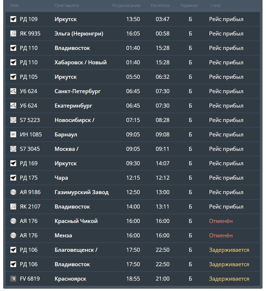 По данным пресс-службы «ИрАэро», рейс № 106 «Благовещенск — Чита» авиакомпании «ИрАэро» задержали почти на пять часов из-за поломки самолёта. Борт уже вылетел и прибудет в Читу в 22:35. Из Читы в Иркутск он отправится в 23:20 вместо 18:50. 🟦Рейс № 109 из Иркутска задержали из-за позднего прилёта этого самолёта. Вместо 18 января в 13:50 он прилетел 19 января в 03:47. 🟦Рейс № 170 из Иркутска задержали из-за плохих погодных условий. При сильных морозах самолёты не летают. Вместо 10:30 борт прибыл в Читу в 14:56. Скриншот с сайта читинского аэропорта 🟦 Подписаться