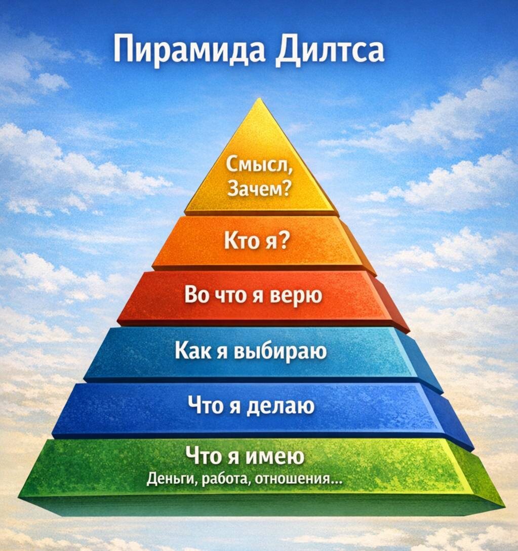 : почему я живу именно так? Есть модель, которая это хорошо объясняет. Она называется пирамида Дилтса. И если упростить, она отвечает на один главный вопрос: почему мы имеем то, что имеем. Модель устроена слоями. И ответ «почему так» всегда находится на уровень выше. Нижний уровень - то, что вы имеете. Ваши деньги, работа, бизнес, дом, семья, окружение. Если задать вопрос «почему у меня именно это?», придётся посмотреть выше - на уровень действий. Следующий уровень - то, что вы делаете. Как вы работаете, отдыхаете, принимаете решения каждый день. Очевидно, что именно повторяющиеся действия формируют результат. Но тут возникает следующий вопрос: почему я делаю именно так? Здесь начинается уровень стратегий и выбора. Как вы живёте: напрягаетесь или избегаете, думаете на годы вперёд или живёте сегодняшним днём. Например, после работы один человек идёт заниматься телом, а другой «выключается» перед экраном. И то и то ОК. Просто это разные стратегии. Но и стратегия не возникает сама